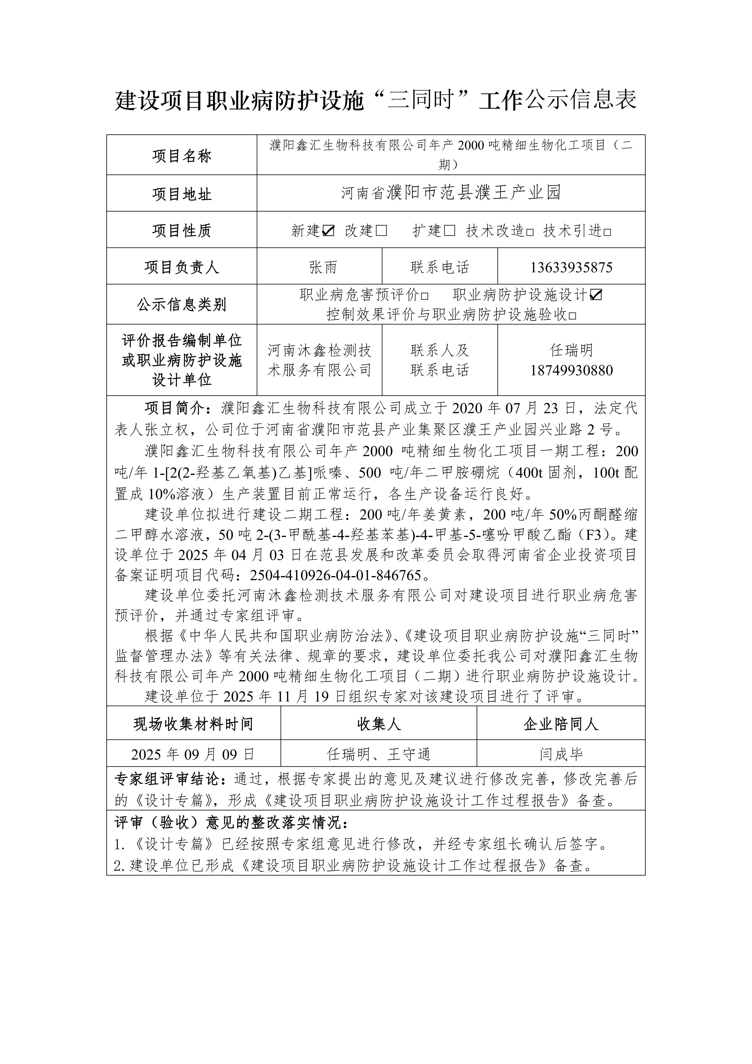 濮阳鑫汇生物科技有限公司年产2000吨精细生物化工项目(二期) 职业病防护设施设计