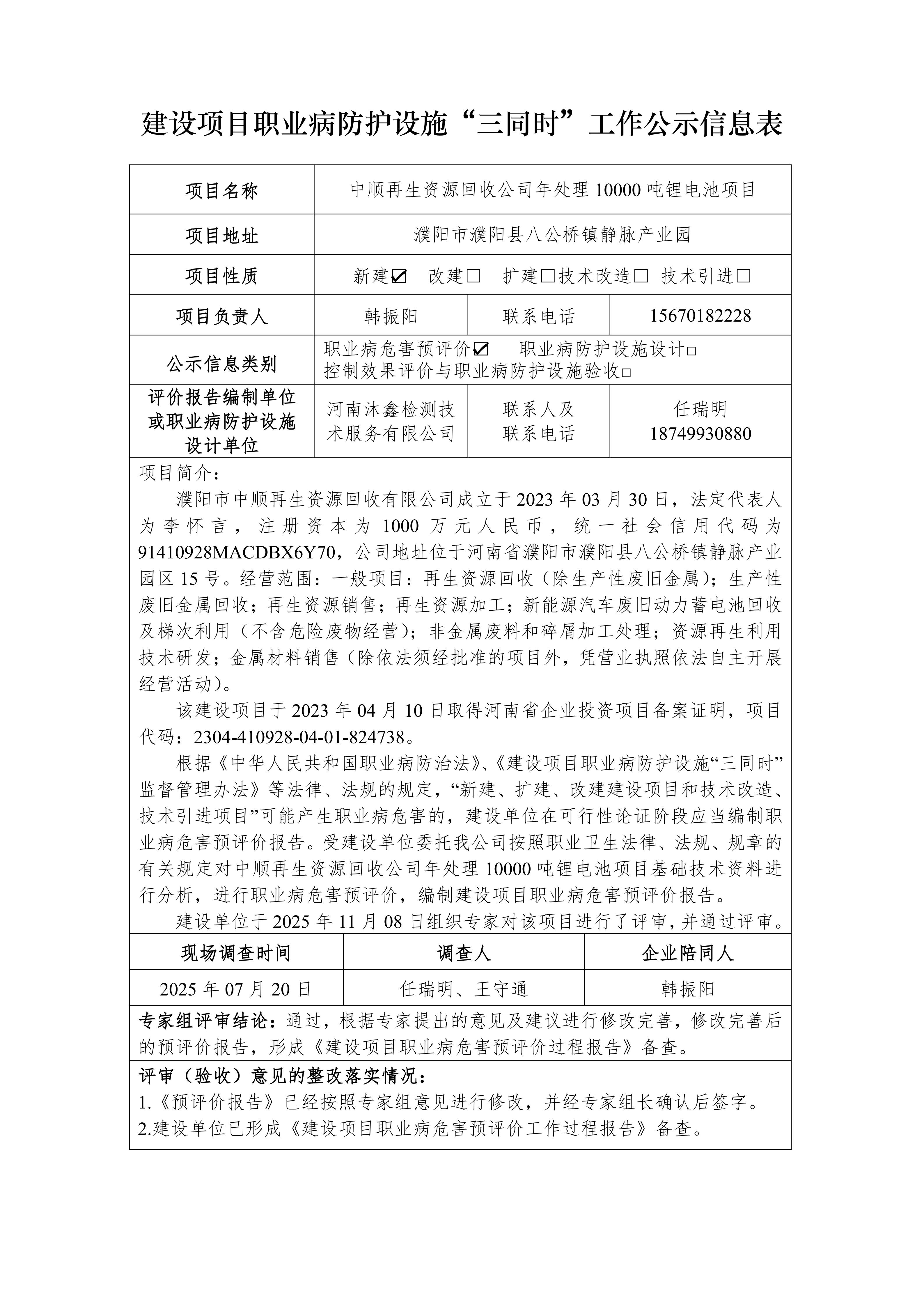中顺再生资源回收公司年处理10000吨锂电池项目 职业病危害预评价