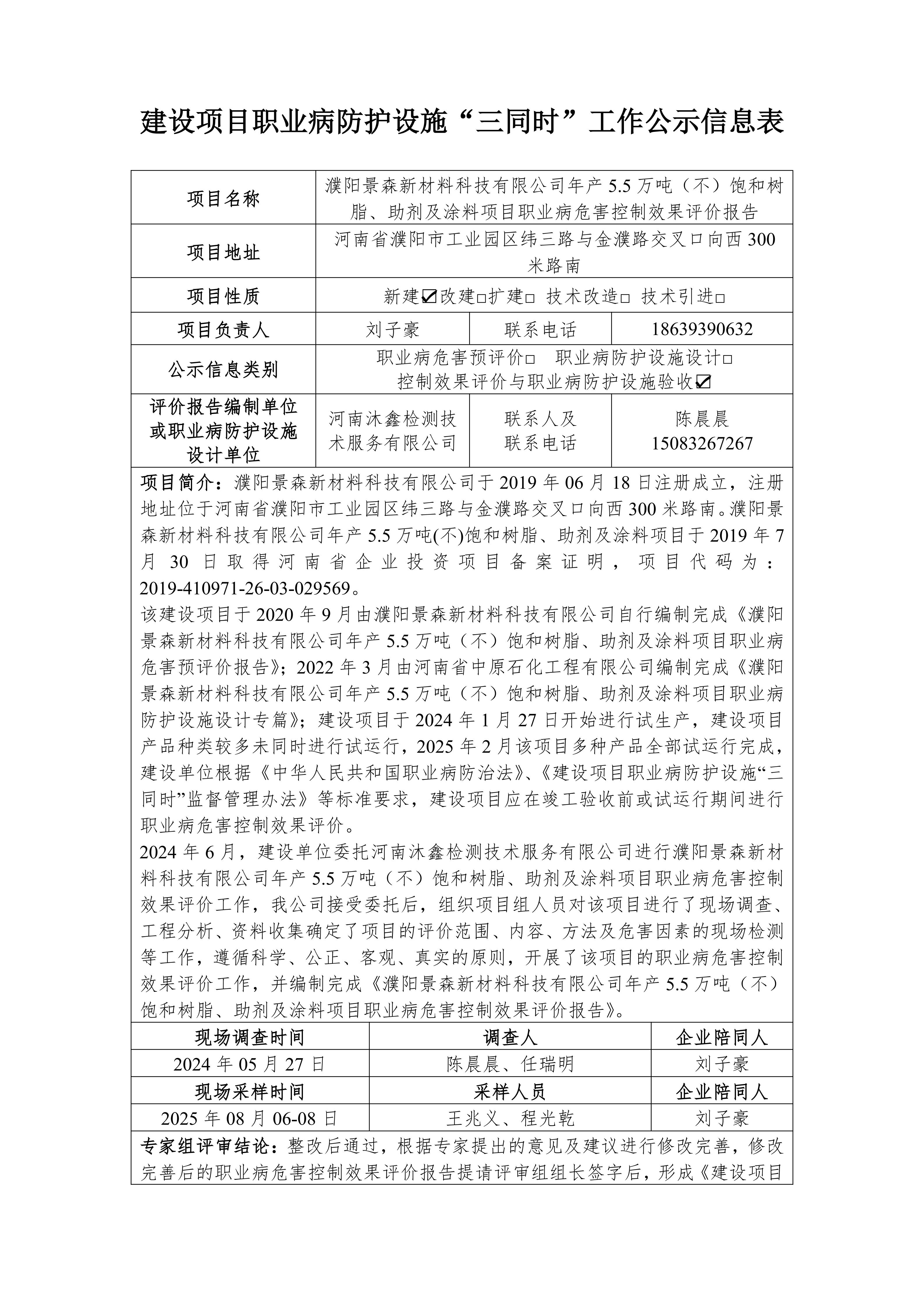 濮阳景森新材料科技有限公司年产5.5万吨(不)饱和树脂、助剂及涂料项目职业病危害控制效果评价