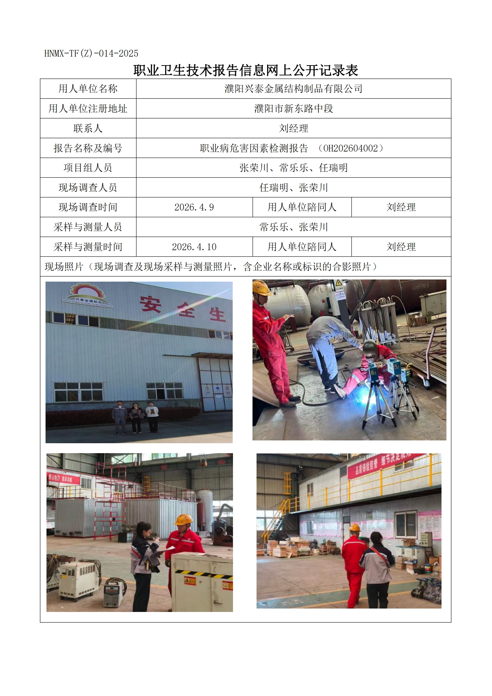 濮阳兴泰金属结构制品有限公司工作场所职业病危害因素