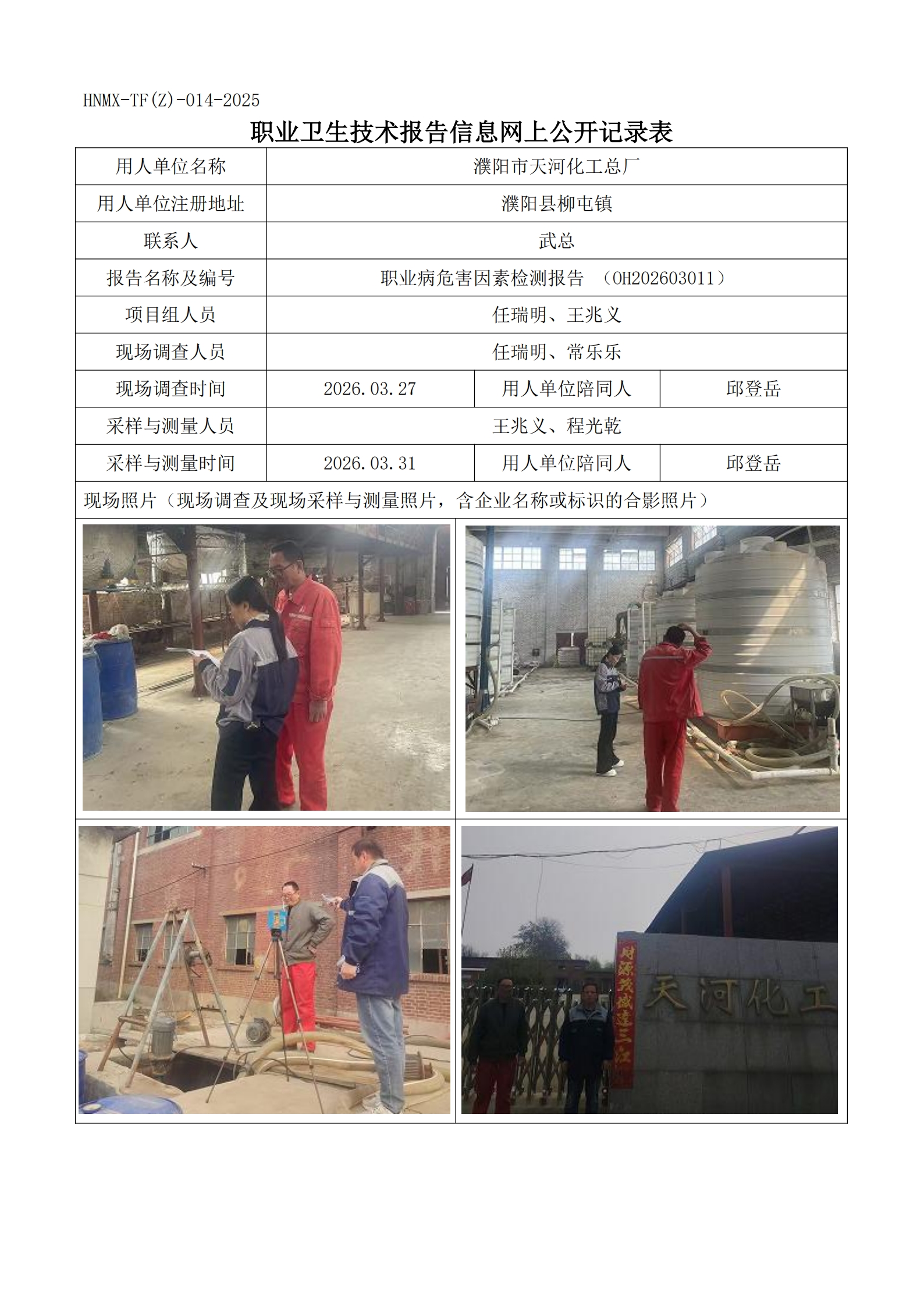 濮阳市天河化工总厂 职业病危害因素检测