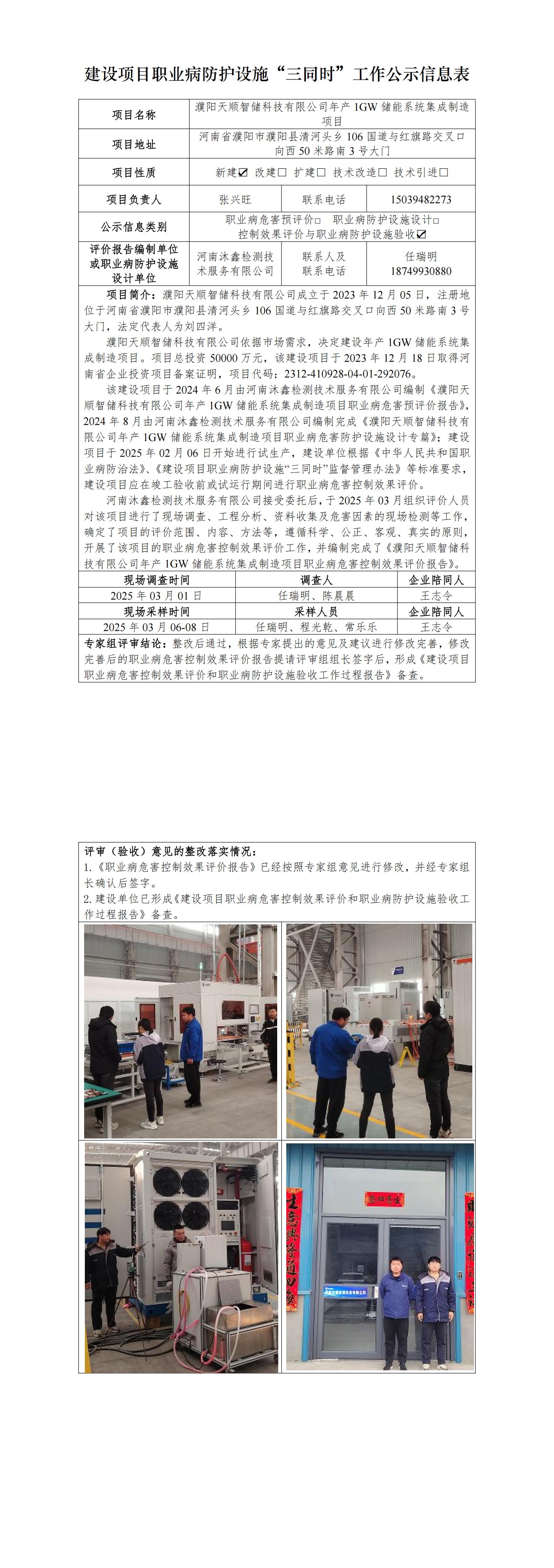 濮阳天顺智储科技有限公司年产1GW储能系统集成制造项目控制效果评价与职业病防护设施验收